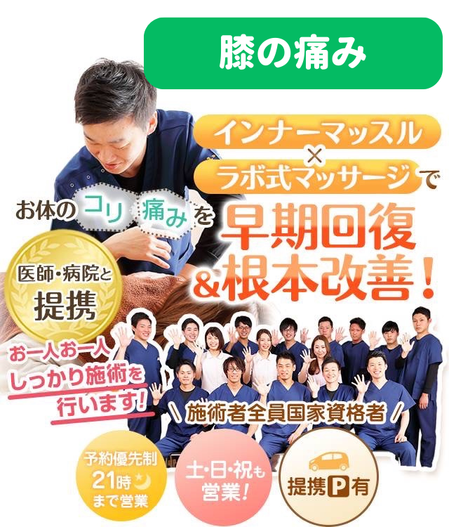 膝痛の場合、腰にあるインナーマッスルがなんらかの原因で硬くなり、その影響が足から膝にかけて現れ結果として膝に痛みを引き起こしている、というケースや、ひざ周りの筋肉が弱くなって緊張状態にあることから膝自体に痛みや不調が現れるケース等があります。